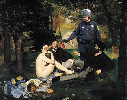 I find these works extremely powerful because they do many things at once: 1) They bring Occupy to America; all the other Occupy imagery was taken from other protests, 2) They re-contextualize famous paintings which represent ultimate peace; Victorian people relaxing in parks and the signing of the US Constitution while contrasting this with the policeman who represents the ultimate oppression of that peace, 3) They save the awesome shot of the policeman who was unfortunately being presented on a dull background in the original photo, 4) They speak a thousand words about Occupy and are extremely modern in that they represent our times perfectly (our times viewed by Occupy at least). To say they are not powerful is ridiculous. And, if they weren't, you wouldn't be so shocked and have written a bunch of posts in this thread. But, you have a right to your opinion of course. I simply don't agree that art is about pleasure.