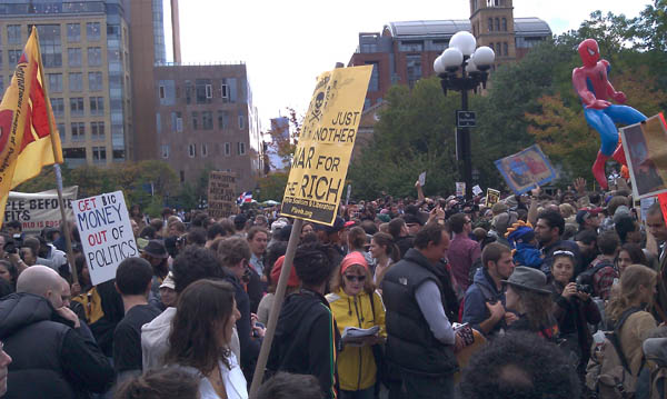 1:29 p.m.. Two thousand are gathered for General Assembly in Washington Square Park. Thousands more are marching to meet them.
